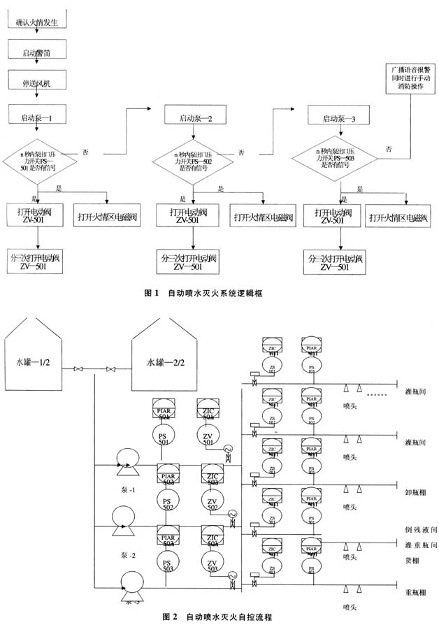 自動噴水滅火系統(tǒng)邏輯框見圖1,自動噴水滅火自控流程見圖2。