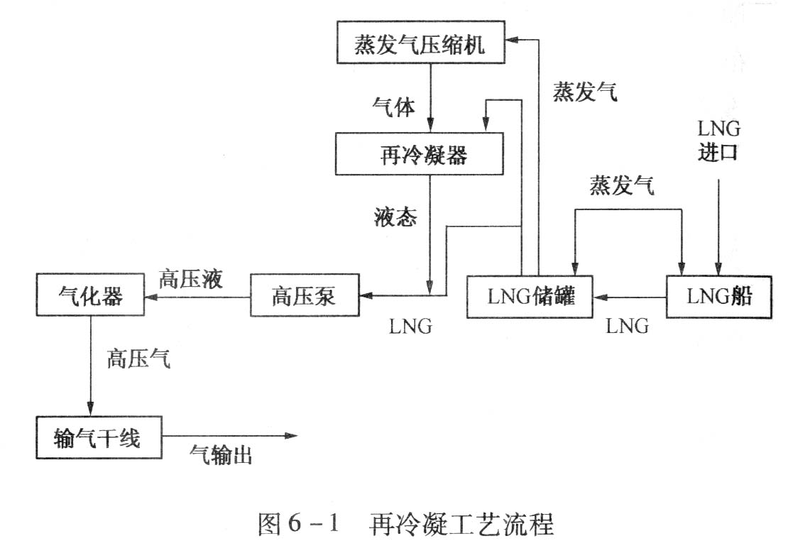 LNG接收站按照對LNG儲罐蒸發氣(BOG)的處理方式不同,接收站工藝方法可以分為直接輸出和再冷凝兩種。直接輸出法是將蒸發氣壓縮到外輸壓力后直接送至輸氣管網;再冷凝法是將蒸發氣壓縮到較低的壓力(通常為0.9MPaG)與由LNG低壓輸送泵從LNG儲罐送出的LNG在再冷凝器中混合。由于LNG加壓后處于過冷狀態,可以使蒸發氣再冷凝,冷凝后的LNG經LNG高壓輸送泵加壓后外輸。因此,再冷凝法可以利用LNG的冷量,并減少了蒸發氣壓縮功的消耗,節省了能量。對于大型LNG接收站大多采用再冷凝工藝。圖6-1所示是典型的接收站再冷凝工藝流程[4]。