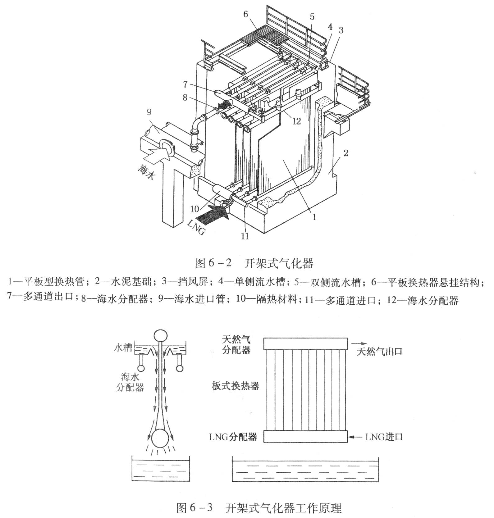 開架式氣化器由一組內部具有星形斷面,外部有翅片的鋁合金管組成,管內有螺旋桿,以增加LNG流體的傳熱。管內為LNG,管外為噴淋的海水。為防止海水的腐蝕,外層噴涂防腐涂層。整個氣化器用鋁合金支架固定安裝。氣化器的基本單元是傳熱管,由若干傳熱管組成板狀排列,兩端與集氣管或集液管焊接形成一個管板,再由若干個管板組成氣化器。氣化器頂部有海水的噴淋裝置,海水噴淋在管板外表面上,依靠重力的作用自上而下流動。液化天然氣在管內向上流動,在海水沿管板向下流動的過程中,LNG被加熱氣化。氣化器外形見圖6-2,其工作原理見圖6—3。這種氣化器也稱之為液膜下落式氣化器。雖然水流動是不停止的,但這種類型的氣化器工作時,有些部位可能結冰,使傳熱系數有所降低。