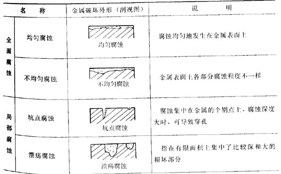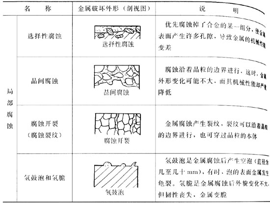 1.金屬腐蝕破壞的類型,見表10-1。這些腐蝕類型容易直接判定,但不能涉及腐蝕過程的機理。例如潰瘍腐蝕可由單獨電化學腐蝕引起,也可以由磨蝕或沖擊腐蝕引起。