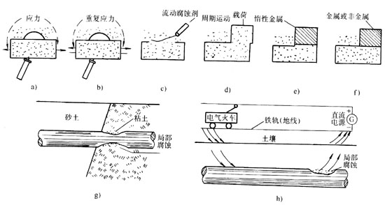 g)土壤中的氧濃差電池腐蝕 h)雜散電流腐蝕