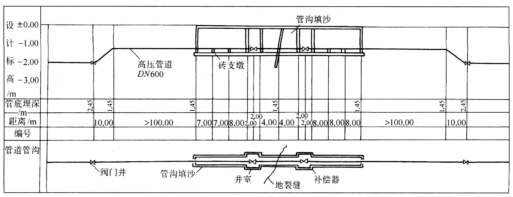 管道穿越活動(dòng)等級(jí)為3、4級(jí)的地裂縫,要求距地裂縫50m范圍內(nèi)不能設(shè)支管,管底埋深控制在1.2~2.1m之間,并以中粗砂作回填土,填至管頂以上3000mm,長(zhǎng)度前后各100m。當(dāng)管道埋深不能滿足要求時(shí),距地裂縫左右50m范圍內(nèi)的管道以地溝形式淺埋,其余不再作特殊處理。