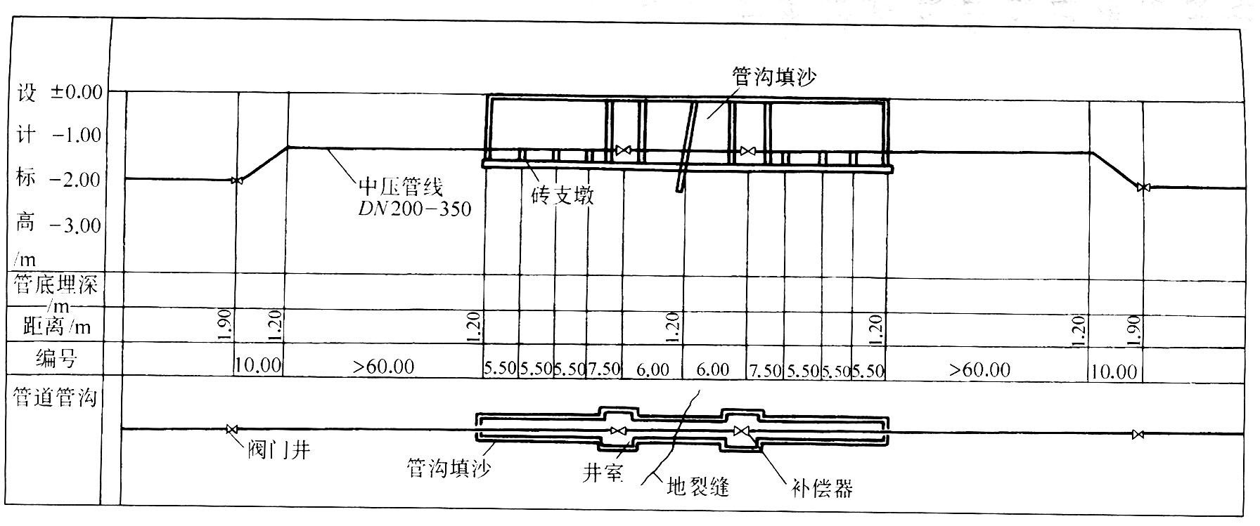 主壓燃?xì)夤艿来┰降亓芽p平、縱斷面圖見(jiàn)圖9-39。中壓燃?xì)夤艿来┰降亓芽p平、縱斷面圖見(jiàn)圖9-40。如圖所示,燃?xì)夤艿揽拷亓芽p即升高,使燃?xì)夤艿罍\埋,以便事故發(fā)生時(shí)進(jìn)行切斷。在距地裂縫100~140m處各設(shè)置閥門井1座,也可與管線相鄰閥門井結(jié)合設(shè)置。管道穿越活動(dòng)等級(jí)為1、2級(jí)的地裂縫,在地裂縫兩側(cè)各裝兩個(gè)小拉桿橫向波紋伸縮節(jié),工作壓力為1.6MPa,波數(shù)為8個(gè)波。波紋伸縮節(jié)安裝時(shí)不必預(yù)拉伸或預(yù)壓縮,安裝后應(yīng)將安裝用的雙頭螺栓拆除。波紋伸縮節(jié)應(yīng)順氣流方向安裝后每半年觀測(cè)1次,5年內(nèi)視情況及時(shí)調(diào)整或更換。