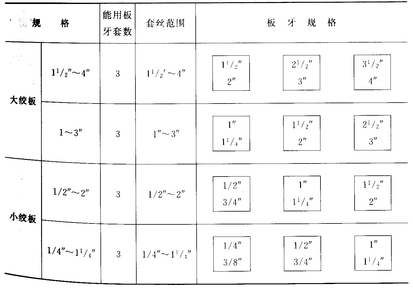 絞板的規格及套絲范圍見表6-3。