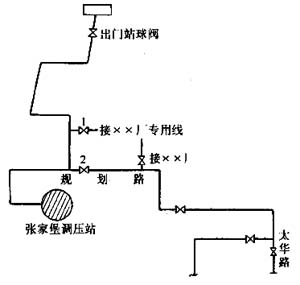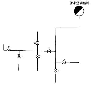 ??? 中壓管道置換見圖1-13-4。檢查中壓管道置換路線所有閥門,使其處于關(guān)閉狀態(tài),2#、3#、4#、5#閥門后暫不置換,均需加裝盲板,分別在1#、2#、3#閥前放散管加裝膠管,用鐵絲固定好,并將膠管引到閥井外3m處進行置換放散;在調(diào)壓站出口閥門后裝U形壓力計,調(diào)整其開度,使其出口壓力不大于2000Pa;當1#放散點聞到臭味時,檢測其含氧量,當小于2%時,關(guān)閉放散閥,拆除放散膠管并檢查閥門井內(nèi)管道、配件及其連接處的嚴密性。2#、3#閥門井放散點操作與1#閥井相同。關(guān)閉調(diào)壓站出口閥門后的放散閥,拆除U形壓力計,緩慢打開出站閥門。在1#閥門后裝設U形壓力計,在4#、5#、6#、7#閥門前裝設放散膠管,膠管引至閥井外3m處進行放散。緩慢打開1#球閥,隨時調(diào)整其開度,使其壓力不大于2000Pa,進行置換放散,技術(shù)要求與上述閥井操作相同;當置換完成后拆除1#球閥處的U形壓力計,關(guān)閉各閥井中的放散閥并拆除膠管,緩慢打開1#閥門。至此,中壓管道置換完成。