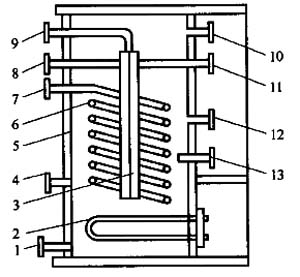 由圖1-11-15看出,該汽化器除了在熱水箱的下部增設(shè)了幾組電熱管外,中上部還多了個(gè)中心管氣液分離室,起著集聚氣體和分離液體的作用,從而保證了外輸氣體的穩(wěn)定。