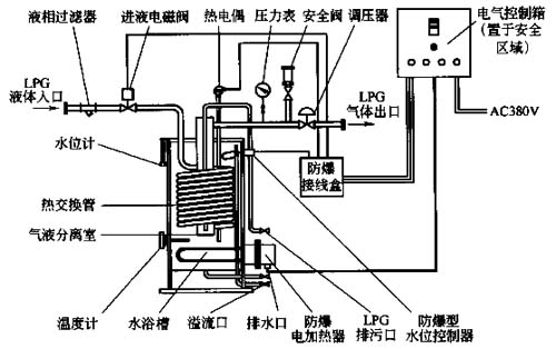 (1)工作原理液化氣由浸沒在溫水中的不銹鋼盤管內(nèi)通過(guò),吸收溫水的熱量后汽化并過(guò)熱,經(jīng)過(guò)氣液分離器脫去重組分后輸入管網(wǎng)。