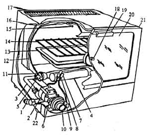 烤箱灶就是將燃燒器、烤箱、燒烤08等組合成的加熱烘烤食物的整體,如圖3—8—2。它由外部圍護結構和內箱組成。內箱包以絕熱材料展16,可減少熱損失,箱內設有承載物品的托網14和托盤13,頂部設置排煙口17。在內箱上部空間里裝有恒溫器的敏感元件15,它與恒溫器2聯合工作,控制烤箱內的溫度。烤箱的玻璃門上裝有溫度指示器18。