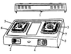 圖3—8—1為壓電自動點火家用雙眼灶。它使用城市燃氣,火眼熱負荷右3.8kW,在3.2kW。灶面采用不銹鋼材料,燃燒器為鑄鐵件,用開關鈕調節器控制火力大小。它由進氣管l、開關鈕2、燃燒器3、火焰調節器4、盛液盤5、灶面6、鍋支架7和灶框8所組成。