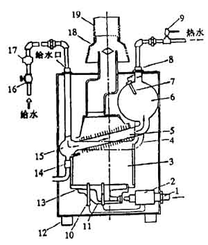 在貯水箱6內設有恒溫器7,通過它和燃氣閥門裝置聯合工作,根據水溫變化情況,來控制燃氣供應量的多少。