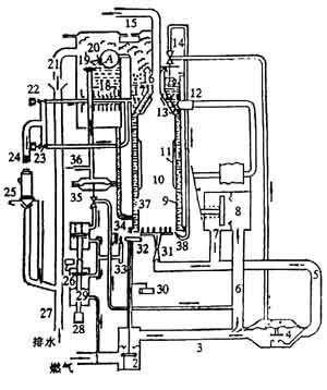 在安全閥2之后分有主路燃氣和分路燃氣。主路燃氣是指經由繼動氣閥4、主燃燒器管5至燃燒器31的管路。繼動氣閥4受浮球控制節流閥14的控制,在運行中繼動氣閥4內皮膜的兩面皆充有燃氣,由于進氣開口大小的差別而使皮膜兩面產生壓差,用其控制繼動氣閥的開閉。流經皮膜下面閥口的燃氣直接流向主燃燒器31;流經皮膜上面的燃氣,經浮球控制節流閥14,去放散小火炬38被燒掉。當停止用水時,沸水箱17中水位升高,致使浮球控制節流閥14關閉,繼動氣閥亦隨之關閉,切斷了主路燃氣的供應;當沸水箱17中水位再下降時,主蹄燃氣管路再重新接通。分路燃氣是指經由分路燃氣管6、恒溫閥8、保溫燃燒器管7至燃燒器31的管路。感溫器12使沸水溫度保持90%以上。感溫器內裝有液體,它使波紋伸縮器動作來控制恒溫閥8開度大小,進行保溫燃燒;當沸水溫度達到98%時,保溫氣路被切斷。