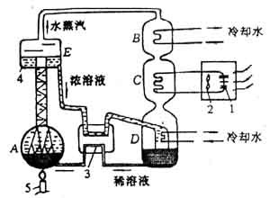 為保持蒸發器內的低壓狀態,需及時取走其中的水蒸氣,為此利用涅化鋰本身具有的強吸水性,讓來自分離器中的濃溴化鋰水溶液在吸收器D中吸收蒸發器中的水蒸氣,吸收熱被冷卻水帶走。此時由于濃溶液吸收水蒸氣后而變成稀溶液,此液經熱交換器又進入加熱器,如此循環往復。
