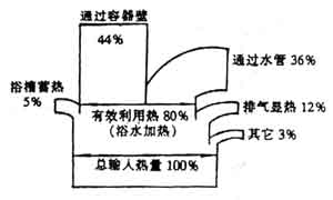 以加熱為目的的燃具,通常都是以“熱輸入二熱輸出”來計算熱量收支。按計算的結果,繪制出熱流圖。如圖3—8—8所示,可以很直觀地表明浴盆熱水器的熱效率為44%+36%=80%,最主要的損失熱為排氣顯熱。