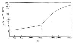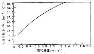 3)提高煙氣流速,煙氣流態(tài)從層流過渡到紊流后,傳熱系數(shù)急劇增加,見圖3—8—11。提高煙氣流速,傳熱系數(shù)增加,如圖3—8—12所示(水管直徑25mm,煙氣溫度660℃,水管溫度60℃)。