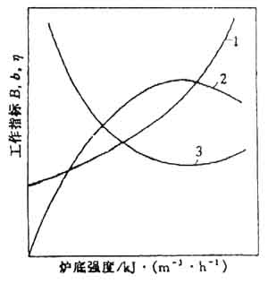 在保證燃氣完全燃燒前提下,應盡可能降低空氣過剩系數,以提高燃燒溫度,減少廢氣量。要注意爐子的密封問題,控制爐底壓力在微小正壓水平,防止冷空氣吸入。要控制合理的廢氣溫度,廢氣溫度越高,熱效率越低;但廢氣溫度太低,爐內的平均爐溫水平降低,熱交換惡化,加熱速度變慢,爐子生產率下降。因此,正確的途徑應該是保持較高的生產率,合理的廢氣溫度,以提高熱效率,降低燃氣消耗。所以在生產率,熱效率和單位熱耗之間有一個合理選擇熱負荷的問題,這個特征如圖3—9—11所示。