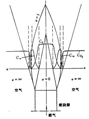 在層流狀態下,氣流混合僅以分子擴散方式進行。如圖,射流以外的空氣通過外邊界線向著燃氣射流擴散,燃氣從射流核心區向著空氣擴散。在某一錐面上,燃氣和空氣(或氧氣)混合的濃度達到化學當量比,即α=1處,便形成穩定的燃燒區,即火焰焰面。