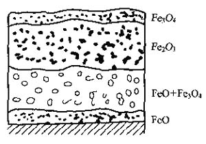 鋼管表面在軋制和焊接的高溫條件下,自然生成一層氧化皮,其主要成分是鐵的氧化物的混合體,從結構上看大體為三層,最外層為Fe3O4或Fe2O3,中間層為FcO和Fe3O4,靠近鋼表面的是FeO(如圖5-2所示)[3]。