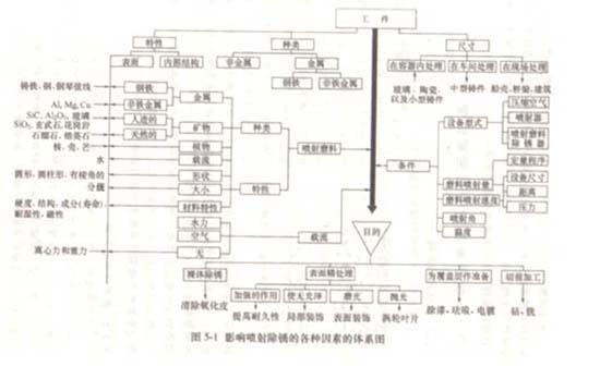 為了正確了解表面預處理,首先應對影響其過程的因素有個完整的認識,圖5—1列出了影響噴射除銹質量各種因素的體系圖。粗線垂直箭頭把噴射對象與噴射目的聯系起來。與粗箭頭左右相連的箭頭,說明達到預期目的而發生作用的因素。根據被噴射工件的特性、種類和尺寸,以及噴射后預期達到的目的來選擇噴射方法、磨料和傳送磨料的載體等。由于涉及到的影響因素很多,因此應很慎重。