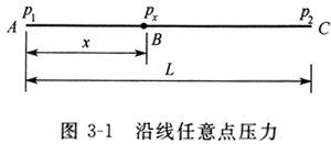 設有一段輸氣管道AC長為L。以x表示管段上任意一點B至起點A的距離,如圖3-1所示。由式(3-1)容易導出輸氣管上的任一點的壓力計算公式: