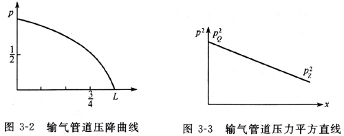 在上式中代入不同的x值,可求得輸氣管道沿線各點的壓力。如代入x=0,得px=p1,即起點壓力;代入x=L,得px=p2,即終點壓力。由該式可看出,輸氣管道的壓力是按拋物線的規律變化的。根據公式(3-7)可做出如圖3-2所示的輸氣管道壓降曲線。