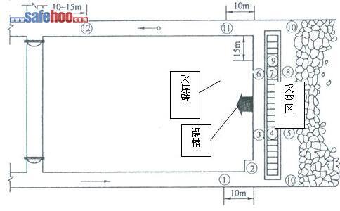 說(shuō)明:1––距采煤工作面10m處的進(jìn)風(fēng)流中測(cè)點(diǎn);2—采煤工作面前切口測(cè)點(diǎn);3、4、5—采煤工作面前半部的煤壁側(cè)、輸送機(jī)槽和采空區(qū)側(cè)測(cè)點(diǎn);6、7、8—采煤工作面后半部的煤壁側(cè),輸送機(jī)槽和采空區(qū)側(cè)測(cè)點(diǎn);9—輸送機(jī)道空間中央距回風(fēng)巷口15m處風(fēng)流中測(cè)點(diǎn)(只測(cè)空氣溫度);10—采煤工作面上下隅角測(cè)點(diǎn);11—距采煤工作面10m處的回風(fēng)流中測(cè)點(diǎn);12—采煤工作面回風(fēng)流進(jìn)入采區(qū)回風(fēng)巷10~15m處的風(fēng)流中測(cè)點(diǎn);13—采煤工作面及其進(jìn)、回風(fēng)巷的冒頂處測(cè)點(diǎn)。