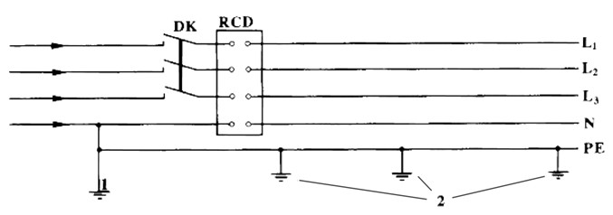 1-NPE線重復接地;2-PE線重復接地;L1、L2、L3-相線;N-工作零線;PE-保護零線;