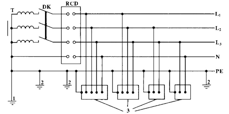 1-工作接地;2-PE線重復接地;3-電氣設備金屬外殼(正常不帶電的外露可導電部分);T-變壓器