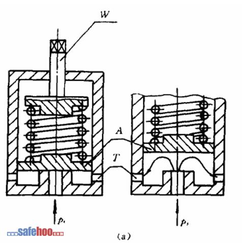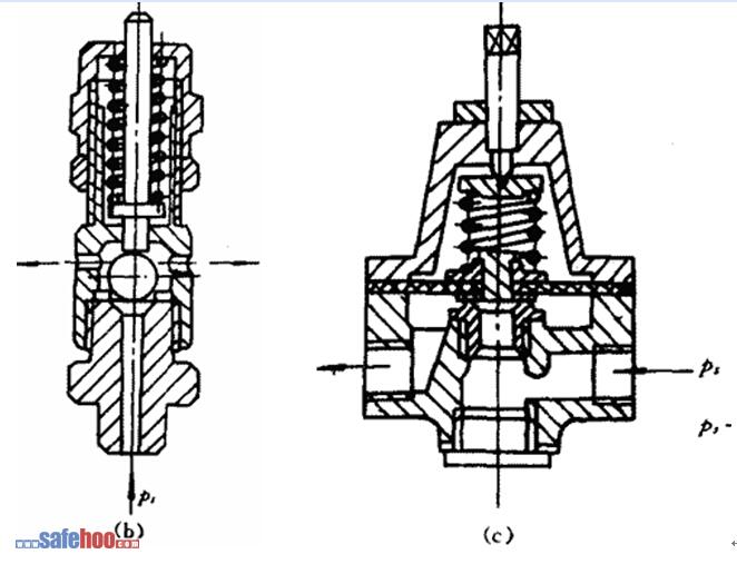 圖b和c分別為球閥式和膜片式安全閥,工作原理與活塞式完全相同。這三種安全閥都是彈簧提供控制力,調節彈簧預緊力,即可改變安全值大小,故稱之為直動式安全閥。