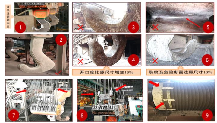 二、吊運(yùn)鐵水、鋼水和液渣起重機(jī)龍門(mén)鉤橫梁焊縫、耳軸銷(xiāo)和吊鉤、鋼絲繩及其端頭固定零件,未進(jìn)行定期檢查,發(fā)現(xiàn)問(wèn)題未及時(shí)整改。