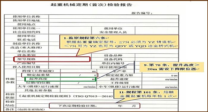 (1)查看吊運(yùn)熔融金屬起重機(jī)定期檢驗(yàn)報(bào)告是否為冶金起重機(jī)(煉鋼廠為鑄造起重機(jī)),是否年度檢驗(yàn)合格。