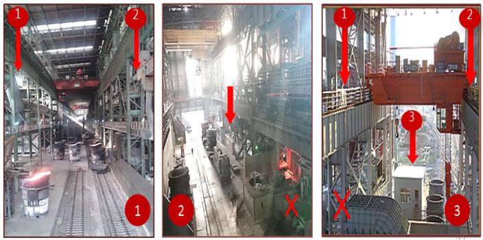 (1)操作室、會(huì)議室、交接班室、活動(dòng)室、休息室、更衣室等人員聚集場(chǎng)所是否設(shè)置在高溫熔融金屬和熔渣吊運(yùn)跨地坪內(nèi)(橫向以靠近吊運(yùn)側(cè)立柱邊線為界,且區(qū)域外的上述建筑物的門(mén)窗應(yīng)背對(duì)吊運(yùn)區(qū)域)。