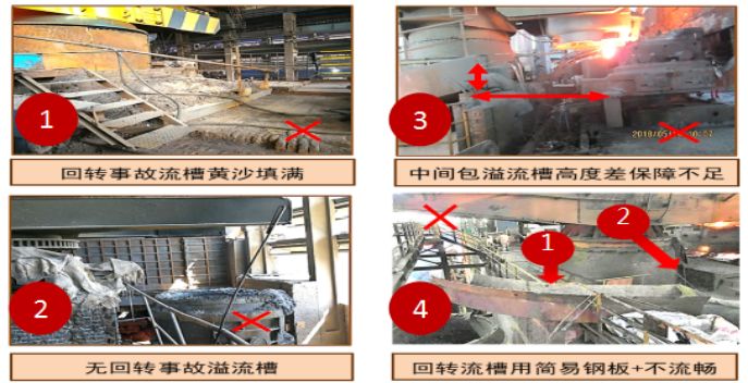 若未規(guī)范設(shè)置鋼水罐、溢流槽等高溫熔融金屬緊急排放和應(yīng)急儲(chǔ)存設(shè)施,易導(dǎo)致鐵水外泄造成爆炸事故。