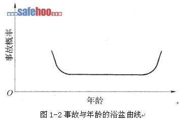 ??? ③生理素質(zhì)。生理素質(zhì)是指影響安全生產(chǎn)的人體生命活動,包括身體條件及生理狀況。主要有年齡、性別、記憶力、體力、耐力、血型、視力、視覺、聽覺、動作反應(yīng)時間和疲勞強度等。比如司機年齡與行車事故之間構(gòu)成的浴盆曲線(圖1-2),出現(xiàn)這種曲線的主要原因在于青年人缺乏必要的工作經(jīng)驗和對自身的控制能力,冒險性強,容易受外界干擾,故易發(fā)生事故;而年長者由于生理機能不斷衰退,體力減退,力不從心,也易發(fā)生事故。