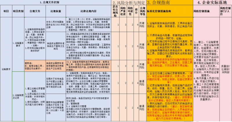 如:人員培訓環節,將適用于企業的法規標準中對人員培訓規定的條款,篩選梳理,形成法規標準依據及條款內容,并進行歸納總結,形成合規義務。對各條款進行分析,按照違反這一條款給企業帶來的風險和發生的可能性判定風險等級。對風險制定出合理建議及應對措施,并將此環節的風險控制劃分到相應的責任部門。通過此方法,整理出企業專屬的合規指南,按照指南的要求進行風險管理的運行。也可以借助第三方的力量,將企業所有合規風險識別,并制定相應的措施,保證食品安全合規。