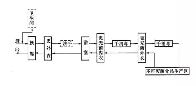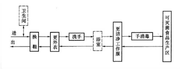 脫下非高潔凈區域工作鞋——穿過隔離區——穿上高潔凈區域工作鞋——洗手、烘干——必要時,穿上防護——洗手后,烘干并消毒(適用時)——進入生產區域