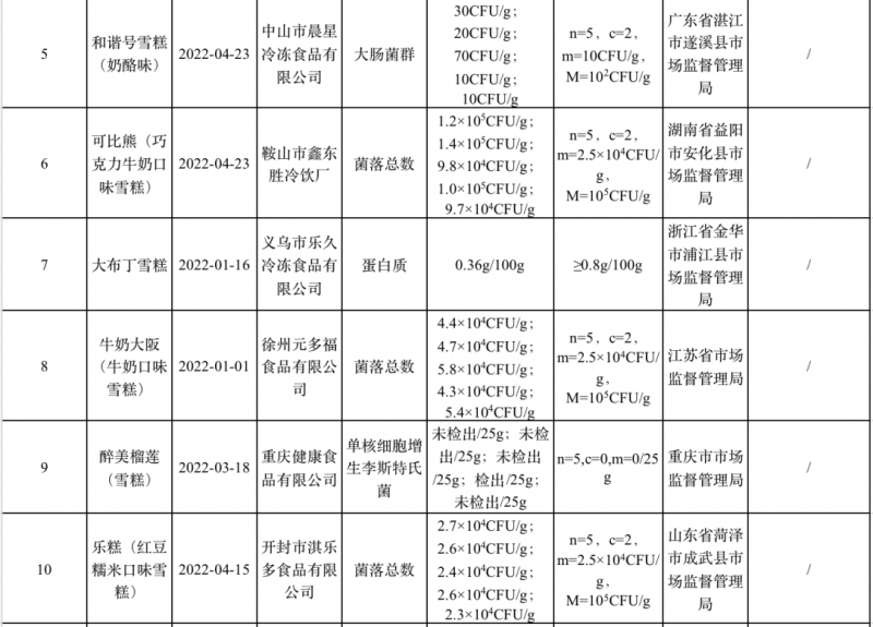 冷凍飲品(雪糕)監(jiān)督抽檢不合格產(chǎn)品信息