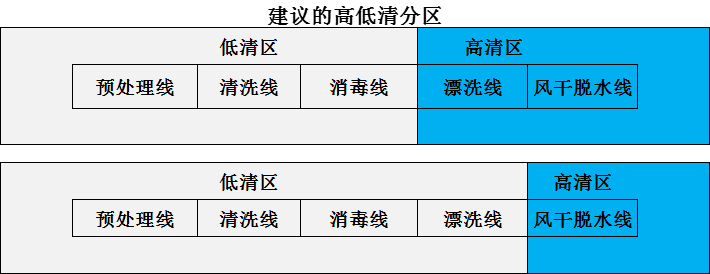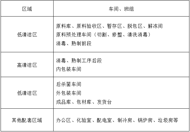 常見的食品車間布局基本按工藝流程低-高-低的布局,即低清清潔區、高清潔區、低清潔區。功能分區如下: