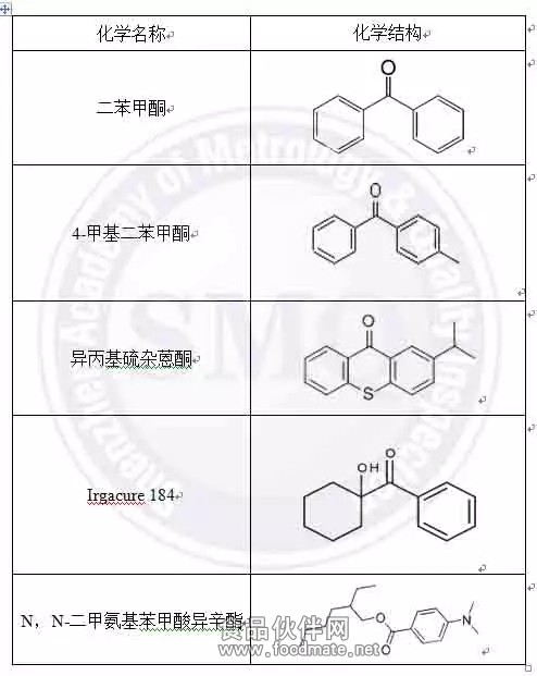 011年,德國宣布召回從比利時進口的冷凍細面條,主要原因是面條包裝上印刷油墨所含有的二苯甲酮(BP)滲透到面條中,導致面條被污染,遷移量達1747μg /kg;2009 年2 月,德國和比利時當局向歐盟委員會(EC)發出警告,稱有些麥片可能被4-甲基二苯甲酮(4-MBP)污染,存在食品安全風險;2005年,意大利、法國、西班牙和葡萄牙的雀巢嬰兒配方奶召回事件引起全社會的強烈反響,罪魁禍首就是配方奶紙盒表面印刷油墨中的光引發劑2-異丙基硫雜蒽酮(2-ITX)和N,N-二甲氨基苯甲酸異辛酯(EHDAB),其遷移量高達120~300μg /L。食品中由于光引發劑殘留遷移而引發的食品安全事件屢見不鮮,引起了社會公眾的關注,到底光引發劑是什么?它有什么危害?下面就由小編為你簡單介紹一下。