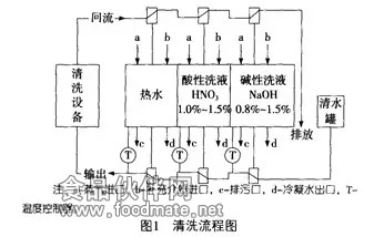 5.1 ?帶有熱表面的巴氏殺菌器和其他設備管道的原地清洗程序。這一類設備的清洗過程必須有一個較長時間的酸洗循環階段,以除去設備及管道熱表面蛋白質的沉積焦結物 ,其原地清洗程序為: 用清水預沖洗設備及管道約 5min;用75℃的堿液(一般用NaOH溶液)循環15min;用清水沖洗約5min;70℃酸溶液(通常用硝酸溶液)循環15min;用90℃熱水沖洗約15min。