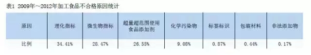 從2009年到2013年我國食用農產品質量安全主要威脅是非法使用違禁藥物和農獸藥殘留超標。但近幾年,我國加工食品質量合格率明顯提升,加工食品安全水平逐步提高。在2009年抽檢中有11類產品的合格率低于90%,而2010年為2類、2011年為3類,2012年為1類。從表1可知微生物指標不合格和超量超范圍使用食品添加劑占不合格因素的55.02%。