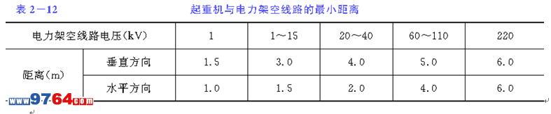 (10) 施工現場附近有電力架空線路時,施工中應設專人監護,確認機械與電力架空線路的最小距離必須符合表2-12的要求。
