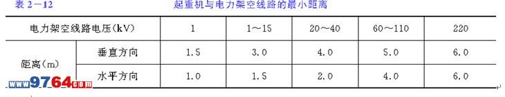 (10) 施工現場附近有電力架空線路時,施工中應設專人監護,確認機械與電力架空線路的最小距離必須符合表2-12的要求。
