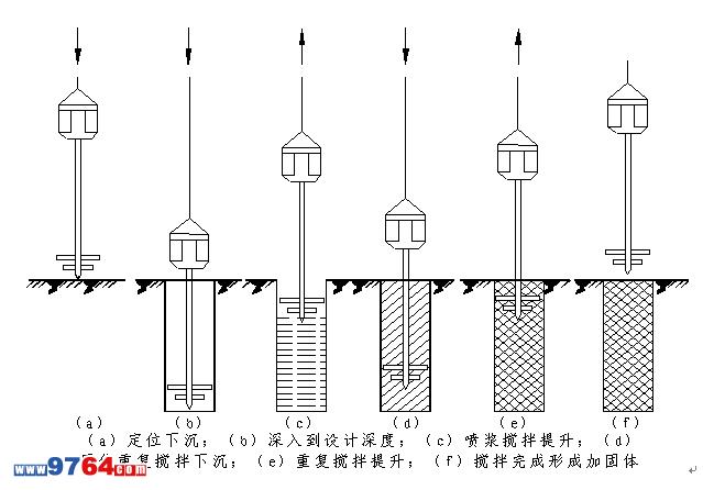 7、重復(fù)上下攪拌:攪拌機(jī)噴漿提升至加固深度的頂面標(biāo)高后,要再次將攪拌機(jī)邊旋轉(zhuǎn)邊沉入土中,至設(shè)計(jì)加固深度后再將攪拌機(jī)提升至地面。