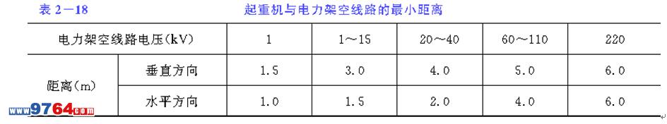 (2) 現(xiàn)場(chǎng)及其附近有電力架空線路時(shí)應(yīng)設(shè)專人監(jiān)護(hù),確認(rèn)起重機(jī)與電力架空線路的最小距離必須符合表2-18的要求。