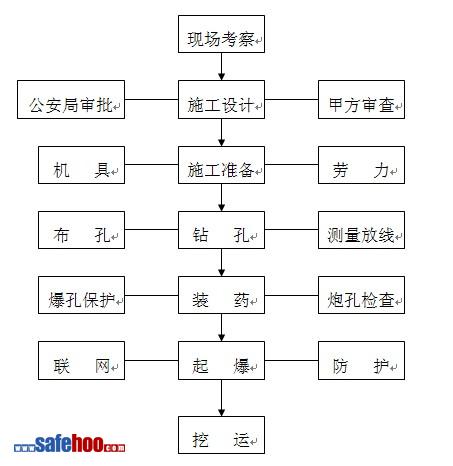 爆破炮眼布置,采用“V”形起爆網絡。施工流程圖如下: