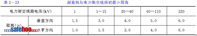 (3) 現(xiàn)場及其附近有電力架空線路時應(yīng)設(shè)專人監(jiān)護,確認機械與電力架空線路的最小距離必須符合表2-23的要求。