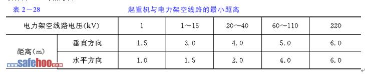 ??????? (4) 現(xiàn)場應無障礙物,現(xiàn)場及其附近有電力架空線路時,確認運輸機械與電力架空線路的最小距離必須符合2-28表的要求。