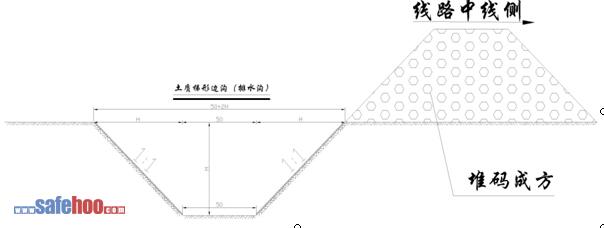 2.3 邊溝在之后的清表工作結(jié)束后,很容易被清除的地表土掩埋,因此為避免此種現(xiàn)象發(fā)生,應將挖出的土堆碼成方,放在邊溝上緣靠中樁方向,如下圖所示