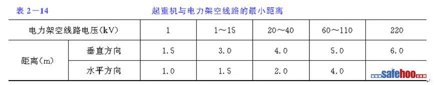 (9) 現(xiàn)場及其附近有電力架空線路時(shí)應(yīng)設(shè)專人監(jiān)護(hù),認(rèn)機(jī)械與電力架空線路的最小距離必須符合表2-14的要求。