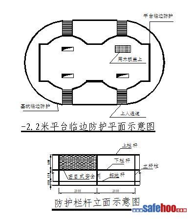 1、在-2.2米平臺周邊臨邊300毫米處,設置防護欄桿,防護欄桿的高度為1.2米,下桿離地高度0.6米,橫桿長度在2米處,設置欄桿柱,防護欄桿必須自上而下,用密目式安全網進行封閉。